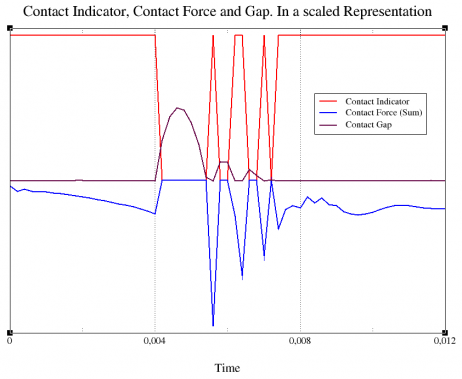 Figure 2 shows the contact indicator (>0 means contact, =0 no contact) together with the contact force and the gap (all curves in a scaled representation). The repeated opening and closing of the top contact can be recognized.