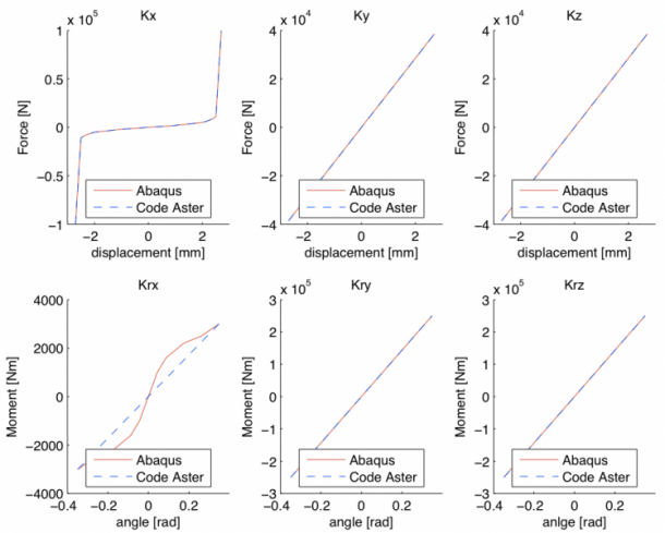 The spring stiffnesses and gap widths are adapted such that a force-displacement curve is approximated (as a polygon) which shows a progressing stiffness in compression. The practical point of this approach: no additional meshing in a PreProcessor is necessary for doubling the line elements because this can be done automatically with the Code-Aster command CREA_MAILLAGE(CREA_GROUP_MA...) So everything is codable in the command-file and runs automatically. This idea was refined using Python to represent all 3 translational and 3 angular spring directions. The figure above shows the comparision of a Code-Aster analysis using this element and results of Abaqus, both representing the same spring characteristics of a rubber element.