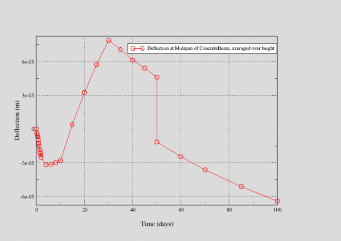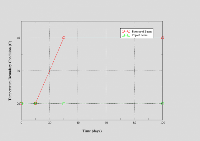 - from t=10 to 30 days: the temperature at top of the beam increases from 20 to 40°C. This causes an extension of the top fiber and a curvature bending the beam up
