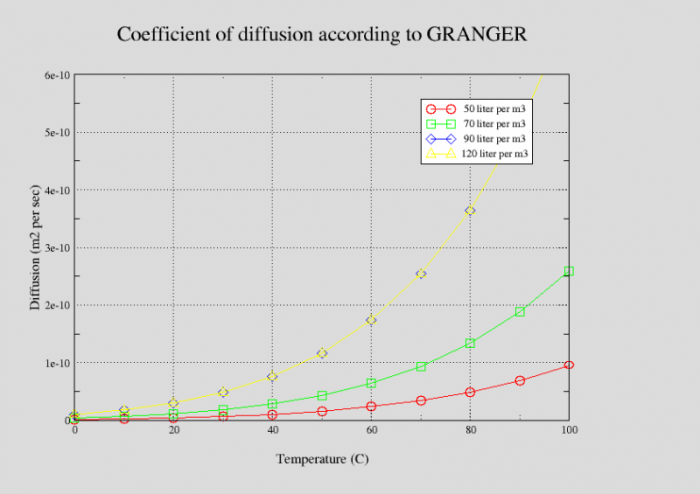 The coefficient of diffusion obbeys the law of GRANGER (see Code-Aster document R7.01.12). It depends on temperature and water concentration and is shown (calculated for the input parameters of this example) in the diagram below.