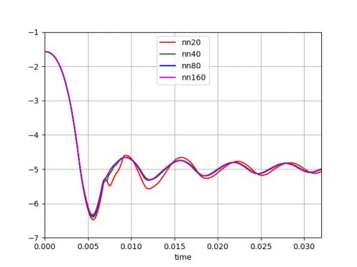 Figure 3 shows the displacement of a “control node” evaluated for different time discretisations. The scope was to validate that inaccuracies due to the “poligonalisation” (too coarsly discretized) of the load history are acceptable.