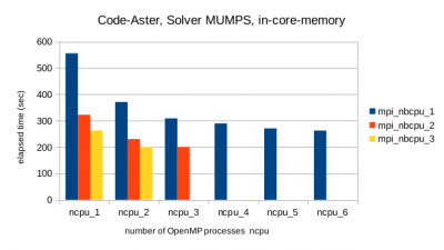 The following 4 diagrams show the elapsed times for the direct solver(s) of Code-Aster (MULT_FRONT and MUMPS) and NX.Nastran. The MUMPS solver is employed with an "in-core" and with a "memory automatic" management. It was detected only afterwards that in case of "MUMPS in-core" and when running several MPI-processes (mpi_ncpu>1) the available RAM was too small, so that swapping of data occured which extended the elapsed time.