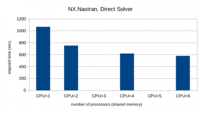 For the investigated model size the direct solver MUMPS (Code-Aster) has the best performance, in particular when used with both types of parallelism. This holds although MUMPS was the only solver which "lost" time due to swapping to the hard disk because 32 GB RAM did not suffice. NX.Nastran shows the longest elapsed times. MUMPS has the disadvantage of the largest need of RAM.