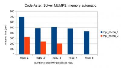 MUMPS knows both, shared-memory (OpenMP) and distributed-memory (MPI) parallelisation. The results show that it is most effective to mix them: setting ncpu=2 and mpi_nbcpu=2 will always reduce the elapsed time compared to the same number of processors using only one of the both parallelisation methods (ncpu=4 and mpi_nbcpu=1 or ncpu=1 and mpi_nbcpu=4).
