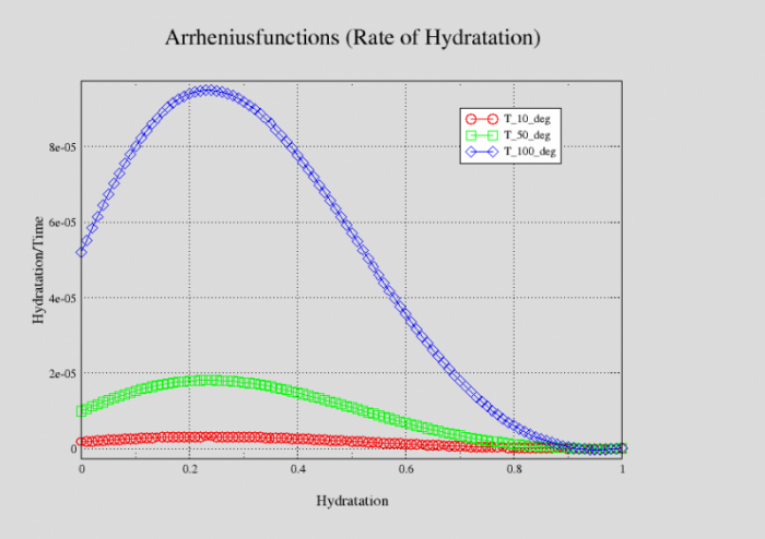 Material parameters are the usual conduction λ and heat capacity capacity ρ x cp (or the function of enthalpy), and the Arrhenius-function. The latter depends on the temperature and the hydratation actual reached and describes the rate of hydratation ∂h/∂t, see figure. The temperature boundary condition shows between 10days and 30days an increase from 20°C to 40°C at the top side of the beam . At the bottom the temperature is constant at 20°C.
