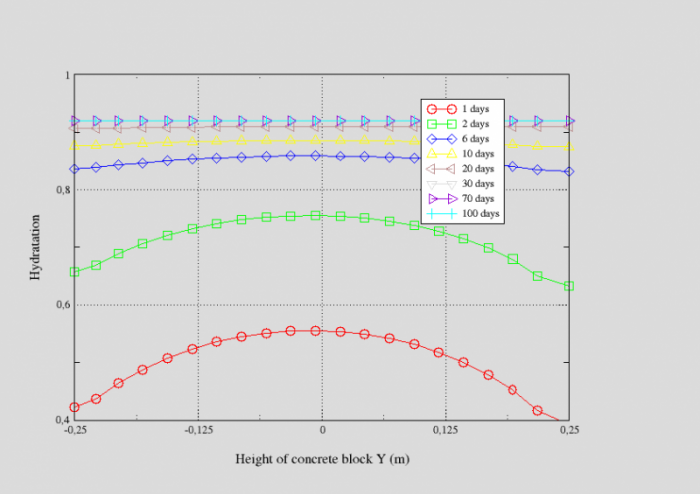 The results are the temperature and the hydratation varying over time and space. The next 2 figures show: