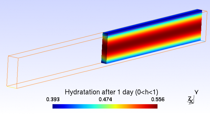 - Coupled Thermo-hydratation-analysis. Unknown field variables are the temperature and the hydratation. The latter starts with h=0 (fluid concrete) and tends to 1 (fully hardened concrete).